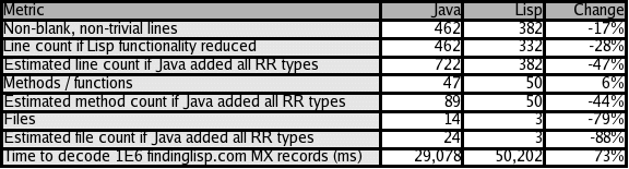 The Java version was 462 lines of code while the Lisp version was 382 lines, a reduction of 17%. While the Lisp version is smaller than the Java version by 80 lines, this initial comparison neglects the difference in functionality between the two versions. The Lisp version decodes 15 of 16 resource record types and includes a UFFI interface to libresolv.so while the Java version decodes only five resource record types and does not include any code to implement the DNS transmission protocol. To correct for this, I edited the Lisp version to remove functionality that was not present in the Java version. The resulting Lisp program was 332 lines long, a reduction of 28% from the Java version.